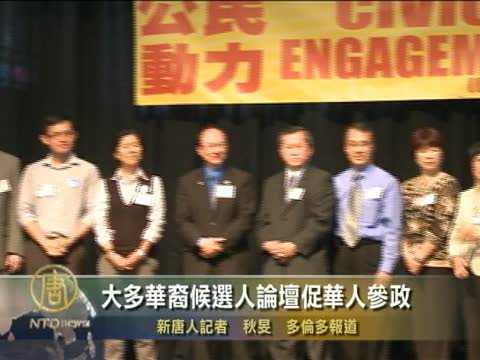 【新唐人2010年7月27日訊】為了促進華裔關心政治,在今年的市選中出來投票,週日下午,大多地區的十幾位華裔候選人參加了民間團體“公民動力”舉辦的“華人參政經驗分享”論壇,在萬錦市的城市廣場與市民見面。