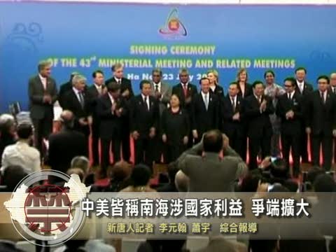 【新唐人2010年7月27日訊】美國國務卿希拉里•克林頓7月23號在東盟論壇會議上表示,解決南中國海水域和島嶼的爭端,是地區穩定的關鍵所在,同時關乎美國國家利益。今年3月中國首次向美方表明,南中國海是關係到中國領土完整的核心利益。中美兩國在南海爭端擴大,引起國際輿論高度關注。
