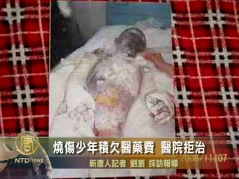 【新唐人2010年7月28日訊】今年11歲的張俊華,兩年前被闖入家中行竊的歹徒,潑汽油放火燒傷﹔他現在仍躺在醫院急需治療﹔但家人花光積蓄借遍親友後,還積欠醫院10多萬醫療費,院方因此停止治療,家人多次向政府求助,但沒有回應,因而希望藉助媒體力量,尋求幫助。