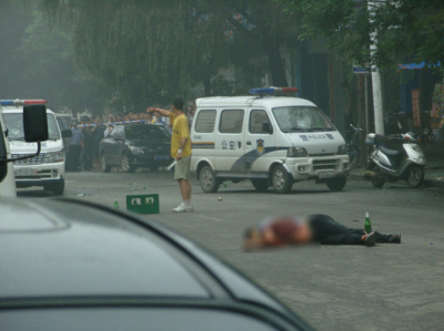 據民衆網上透露,砍人的男子叫王才軍,騎摩託車闖紅燈,交警駕車追上後,踢了王才軍一腳和打兩個耳光,激怒了對方,兩人撕打起來,最後導致這場悲劇。