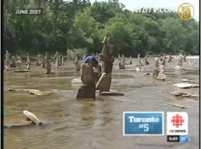 在多倫多市中區的humber河上突然一夜之間就多出了幾十座小型的石頭堆,這些石碓都堆得整整齊齊,而且錯落有緻。這讓當地的居民又驚又喜,原來這是一個名叫 peter riedel的藝術家的作品,他花了4個小時的時間來堆砌這些石塊,目的是為大家高興一下,他在2007年的7月也做過同樣的事。