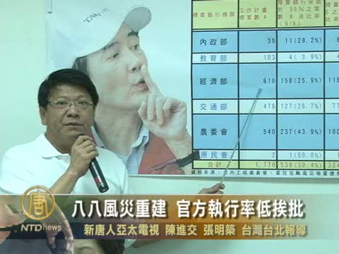 【新唐人2010年8月5日訊】去年八八風災後,立法院朝野兩黨迅速編列通過了為期四年、1,200億的「莫拉克颱風災後重建特別條例」,今天,立委列出近一年來重建經費的預算執行情況,發現在1,770項重建標案中,有三成的標案執行率低於50%,兩成的標案預算執行率是零,在野立委大表不滿,要求嚴格考核執行績效。