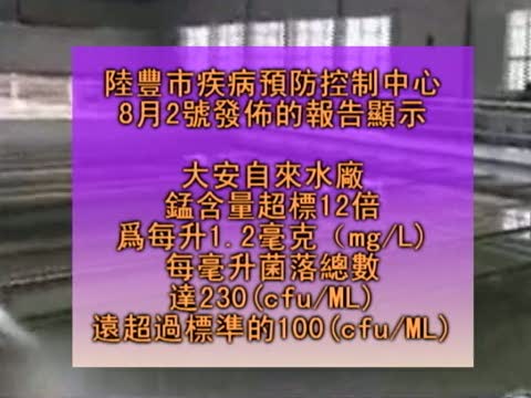陸豐市疾病預防控制中心8月2號發佈的報告顯示, 大安自來水廠的錳含量超標12倍,爲每升1.2毫克(mg/L),每毫升菌落總數達230(cfu/ML),遠超過標準的100(cfu/ML)。