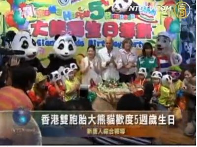 【新唐人2010年8月9日訊】星期天(8月8日),香港海洋公園裡兩只可愛的雙胞胎大熊貓度過了不平凡的5週歲生日。小朋友們為他們獻上了一曲“生日快樂”,公園還為他們呈上了精美可口的生日蛋糕。