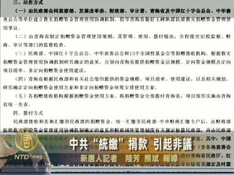 【新唐人2010年8月10日訊】中國近年來天災人禍不斷,今年已經發生過地震、旱災和洪災,海內外的捐款不斷,青海玉樹地震後,中共民政部提出,慈善機構所募集的善款,交由青海省統籌安排使用,引起了民眾非議,有網民指出,捐款都被共產黨貪官污掉了,降低了民眾捐款意願。