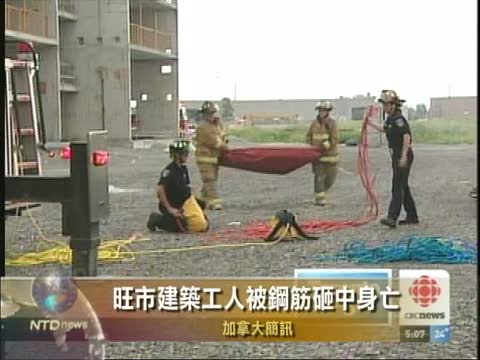 今天下午,大多倫多地區的旺市的一個建築工地發生了一起意外事故,一名建築工人在施工的時候被落下的鋼樑砸中身亡。出事地點是在7號高速公路和400高速公路交界的的一個建築工地上。警方說當時工地正在上鋼樑,澆注水泥,其中一根鋼樑脫落,擊中了正在4樓作業的受害人。事故發生後,消防人員和救護人員很快趕到了現場,但受害人因重傷,當場死亡。事發後,該建築工地被封閉,驗屍官和省勞工廳的工作人員也將調查此事故。