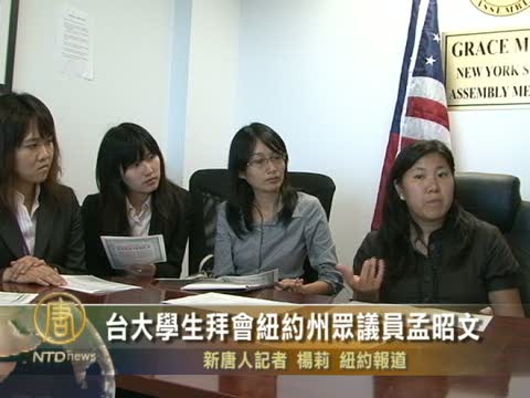 【新唐人2010年8月10日訊】由中華民國僑委會和外交部共同主辦的“99年國際事務青年人才培訓計劃”的6名在紐約學習的同學,8月9日下午在紐約華僑文教中心副主任劉素秋的帶領下,訪問紐約州眾議員孟昭文,請看詳細報導。