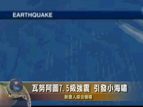 【新唐人2010年8月10日訊】太平洋島國瓦努阿圖(Vanuatu)星期二發生規模7.5級的強震,這次地震發生在海底35公里處,距離首都維拉港僅40公里,大震之後還發生幾次餘震,數千名居民逃離到山坡等高處避難。目前還沒有傷亡消息傳出。地震後曾出現23厘米高的小海嘯,但太平洋海嘯警報中心警告,其他地區可能出現更大的海嘯。