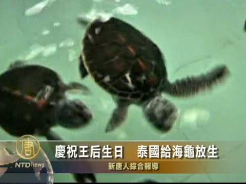 【新唐人2010年8月11日訊】8月10號,為慶祝12號王后詩麗吉的78歲生日,泰國依照慣例舉行了盛大的慶祝活動,包括給779只綠海龜放生。