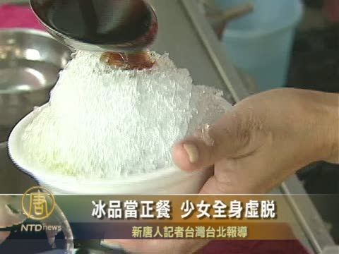【新唐人2010年8月11日訊】夏天很多人喜歡吃冰消暑,但小心,照三餐吃冰可能會出大問題,臺北市有位17歲少女,正餐不吃,天天吃冰,突然胸悶、頭痛、全身無力送醫。中醫警告,吃過量冰品會造成胃腸溫度過低,血液濃稠,1天1碗挫冰,60歲就有可能出現心肌梗塞。