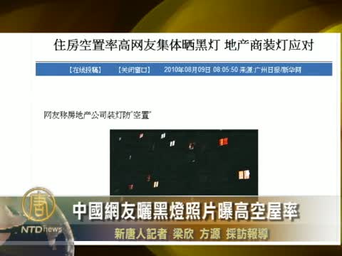 【新唐人2010年8月11日訊】近日大陸一網站發起“網友集體曬黑燈”活動,用“黑燈率”來證明小區房屋的空置率。從網友的照片可以看出無論上海、廣州還是北京,房屋空置率平均達5成以上。