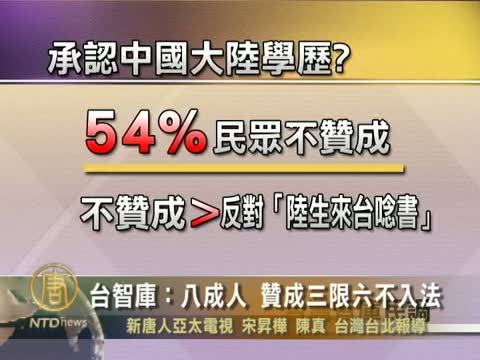 【新唐人2010年8月15日訊】台灣立法院將處理有關陸生來臺的三3項法案。台灣智庫民調表示,反對「承認中國大陸學歷」的比例,多於反對「陸生來臺唸書」的比例,他們指出,有8成以上的民眾認為陸生來臺管制應該立法明訂,要求「三限六不」入法。
