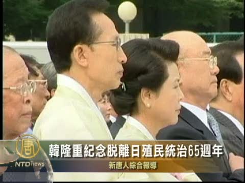 【新唐人2010年8月15日訊】韓國星期日在首爾光化門廣場舉行儀式,紀念韓國脫離日本殖民統治後光復65週年。韓國總統李明博在儀式上積極評價了日本近來為其殖民統治向韓國的反省和道歉,他還呼籲朝鮮放棄核野心,促成朝韓和平統一。