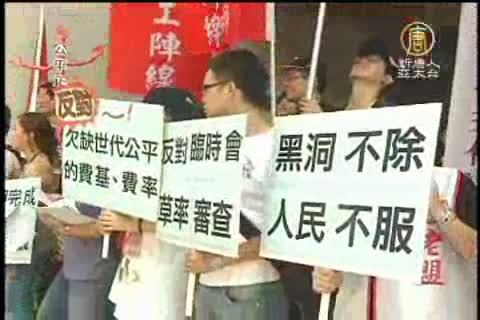 【新唐人亞太台2010年8月16日訊】那麼今天登場的立法院臨時會,可以說場內場外都鬧哄哄,由於全民健保法修正草案,也就是二代健保可能夾帶闖關,消基會和監督健保聯盟在場外齊聲抗議。