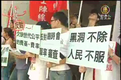 【新唐人亞太台2010年8月16日訊】那麼今天登場的立法院臨時會,可以說場內場外都鬧哄哄,由於全民健保法修正草案,也就是二代健保可能夾帶闖關,消基會和監督健保聯盟在場外齊聲抗議。