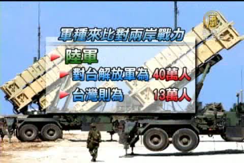 陸軍部分,對台解放軍為40萬人,台灣則為13萬人。