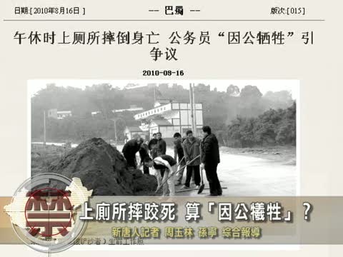 【新唐人2010年8月18日訊】最近,四川一名公務員,午休期間在廁所摔倒死亡,被認定為“因公犧牲”,在互聯網上引起巨大爭議,輿論認為,“因公犧牲”已經變成了公務員的“死亡福利”。