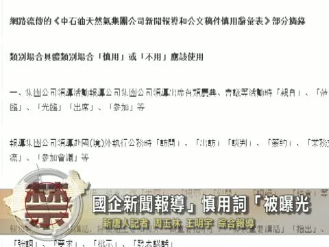 【新唐人2010年8月20日訊】最近,一份《中石油天然氣集團公司新聞報導和公文稿件慎用辭彙表》在網上流傳,圍觀點評的網友眾多,有人直接指出,這是中共壟斷行業的傲慢和對新聞的軟暴力。