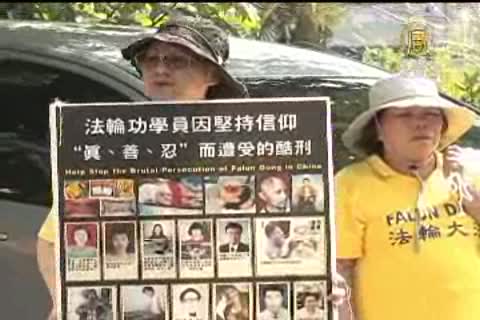 不過,在他所到之處,都能看見有法輪功學員拉著橫幅、高舉酷刑迫害展板和控告黃華華的訴狀放大版。明天黃華華即將離開台灣,法輪功學員希望他在離台前清楚聽見他在台灣被控告的真相。