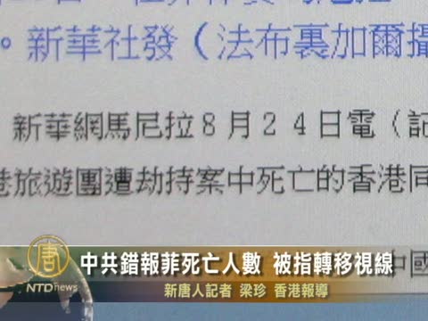 【新唐人2010年8月25日訊】菲律賓槍手挾持香港旅行團慘劇,導致15名人質8死7傷。星期二,中共官方新華社一度將死亡人數誤報為9人,致使大陸及海外媒體紛紛轉載。有大陸媒體人認為,中共高調報導此事,是想轉移民眾視線,化解國內危機。