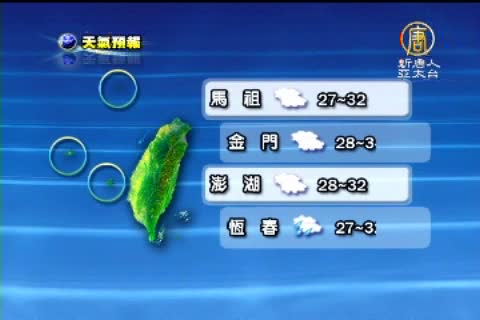 【新唐人亞太台2010年8月25日訊】來關心天氣,明天台灣東南部及東部地區有局部短暫陣雨,中南部及北部地區午後也有局部短暫雷陣雨,提醒民眾出門記得攜帶雨具。以下帶您關心8月26日星期四,全台各地以及世界各主要城市的天氣預報。