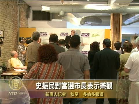 【新唐人2010年8月26日訊】多倫多市長選舉的熱門人物,前安省副省長史振民,8月24日在競選辦公室會見少數族裔媒體,為選舉造勢。儘管與目前排名第一的候選人福特之間差距不小,但史振民顯得相當自信。