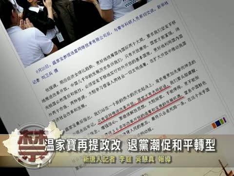 【新唐人2010年8月26日訊】在深圳經濟特區建立30週年前夕,中共總理溫家寶8月21號在深圳考察發表講話,再次提出要推進政治體制改革,幷指出停滯和倒退最終只會是死路一條。溫家寶的講話引起海內外輿論廣泛關注。外界分析認爲,中共解體是歷史的必然,退黨大潮終將引導中國走向和平轉型之路。