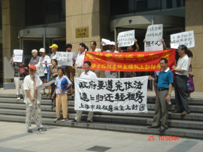 經租房主們打橫幅喊口號在上海市政府前抗議