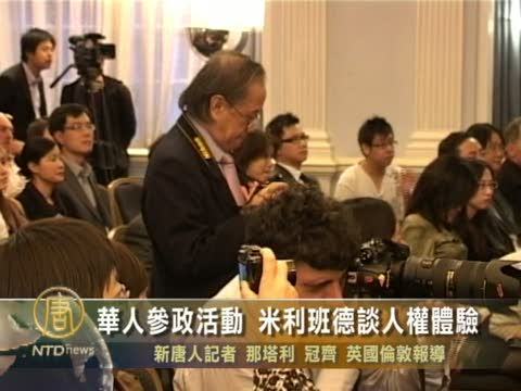 【新唐人2010年8月26日訊】英國前外交大臣、反對黨工黨領袖候選人米利班德,24號,受工黨華人主席梁辛尼之邀,在一項旨在推動華人參政的活動中,發表講演。講演中,米利班德談到他對人權的個人體會,強調人權是普世的。