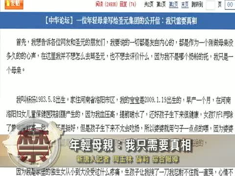 最近,一位年輕母親寫給聖元集團的公開信,在大陸育兒網站上流傳,這封公開信的標題是:《我只需要真相》。