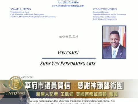 【新唐人2010年8月28日訊】神韻紐約藝術團在美國首都華盛頓的六場公演本週正在進行。華盛頓市議員紛紛發來賀信,感謝神韻為這裡的觀眾們帶來世界級的演出,恢復失落的中華傳統文化,並介紹給新的觀眾。