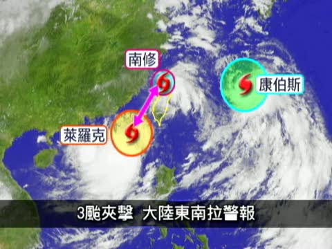西太平洋和南海3個颱風不一定都會侵襲台灣,但預料都可能會「登陸」,並在大陸東南沿海形成夾擊之勢,江蘇、浙江、福建、廣東等地防颱單位都已經拉警報。