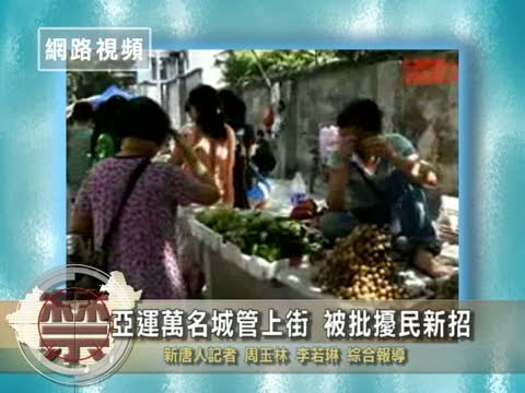 【新唐人2010年9月1日訊】隨著亞運會的臨近,廣州人的平靜生活越來越受到衝擊,中共當局除了大規模的強制拆遷等擾民措施外,最近又有一個整治流動商販的大規模行動出臺。有網友評論說,中共當局爲了自己的面子,不顧老百姓的死活。