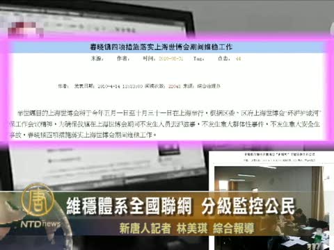 【新唐人2010年9月1日訊】星期一在大陸網絡上曝光了寧波市春曉鎮一份維穩文件,泄露了中共當局在上海世博期間,設立了一個對公民進行分級標記和控制的系統。而浙江知名博客作者郭衛東上週六發現自己被列入“維穩三級”的對像。