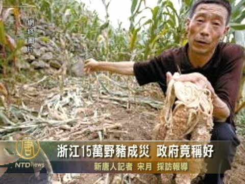 【新唐人2010年9月3日訊】近年來,浙江省野豬氾濫成災,導致部分農田絕收,政府卻無對策出臺,農民只好放棄良田外出打工。當局對此竟然表示,野豬數量增多是好事,證明生態環境保護得好。