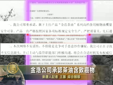 【新唐人2010年9月3日訊】中國又一“國家免檢產品”出現問題﹔知名“金浩茶油”證實致癌物苯並芘嚴重超標﹔金浩公司近日在其官方網站發佈聲明道歉。目前仍有近9噸問題茶油,該公司沒有交代流向。