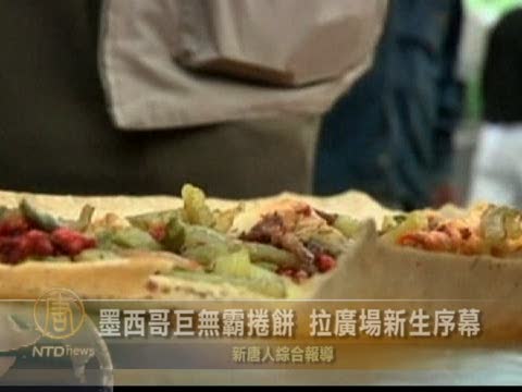 【新唐人2010年9月4日訊】墨西哥市為了讓市中心一處酒客聚集的廣場改頭換面,特別企畫了一系列的活動。9月3號,居民們準備了一個長近41米的傳統美食,墨西哥玉米捲餅:Taco,為活動拉開序幕。這個捲餅同時也創下了墨西哥製作的最長捲餅的記錄。