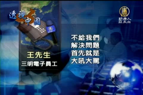 【新唐人亞太台2010年9月4日訊】中國廣東東莞再度發生員工抗爭事件,起因是三明電子公司已經兩個月沒發給員工工資,還有50名員工被房東趕出宿舍,經過當地政府部門出面協商,結果竟然是薪資打五折,讓員工無法接受,8月31號集體到政府部門靜坐抗議,引發警民衝突,造成三名員工被打傷,送醫急救。