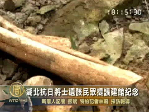 【新唐人2010年9月6日訊】中國湖北省宜昌市夷陵區黃花鄉南邊村宜巴高速公路,近日施工中發現有大量屍骨。經考證為抗戰時國民黨75軍預備第四師將士遺骸。當地民眾提議為抗日將士建紀念館。