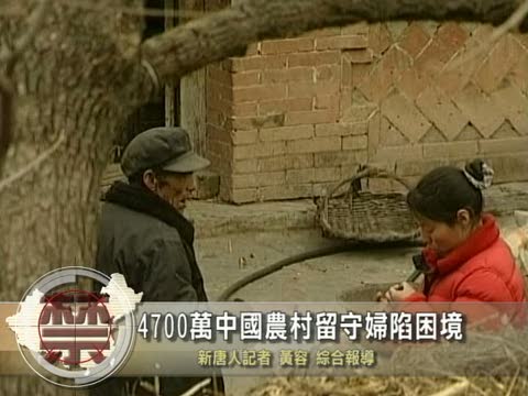 【新唐人2010年9月7日訊】中國農村留守兒童的問題被引發關注之後,另一個農村留守婦女的問題也浮出水面。隨著大批農村男子離家前往城市打工,中國農村留守婦女的數量日益增多,而且面臨生活中的許多困難,承受著勞動強度高、安全感低、精神空虛等多重問題。