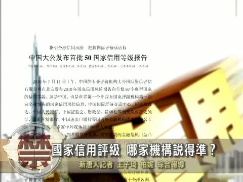 【新唐人2010年9月7日訊】造假事件,在中國大陸一直絡繹不絕,正當中共政府公信力遭到嚴重質疑的同時,最近,中國出現了一個民營信用評級機構“大公國際”。針對評量國家信用風險信息的“大公國際”,它的背景和評級報告內容,卻遭到網友紛紛質疑。在西方國家,“大公國際”也沒有市場。