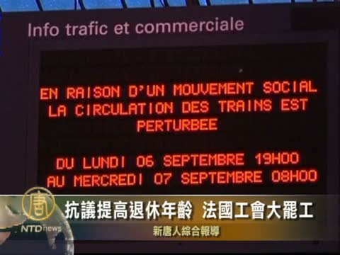 【新唐人2010年9月7日訊】星期二(9月7日),法國工會為了抗議政府提出的提高退休年齡的計劃,發動全國性罷工。罷工行動迫使公共交通和政府服務停擺,數百萬人陷於交通混亂之中。