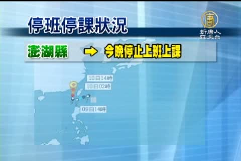 【新唐人亞太台2010年9月9日訊】輕度颱風莫蘭蒂目前暴風圈已經進入澎湖地區,由於風雨逐漸增強,先為您播報目前各地最新的停班停課狀況。澎湖縣政府已經宣布:今天晚上停止上班上課;台東縣大武鄉、達仁鄉和金峰鄉也從下午3時30分起停止上班上課;至於高雄縣各級學校還有高雄市高中職以下各級學校宣布今晚停課。