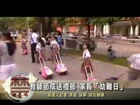 【新唐人2010年9月10日訊】今天也就是9月10號是中國的教師節,每到這個節日,家長們總是要費盡心思為老師挑選禮物。百貨公司千元的禮券、名牌飾品都是熱選,甚至還有家長將他的私家車借給老師開。有家長在網上說,怕孩子在學校不被老師關注,只能是送禮買個放心,因此教師節成了「送禮節」。