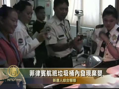 【新唐人2010年9月13日訊】星期天(9月12日),菲律賓馬尼拉機場工作人員在抵達的一架航班中打掃機艙時,發現一名剛剛生下來的男嬰被遺棄在機艙衛生間的垃圾桶裡,目前警方正在尋找棄嬰的母親。