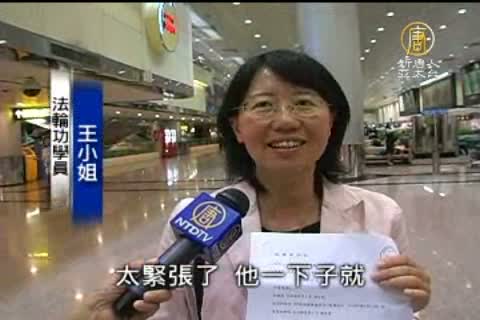 法輪功學員 王小姐:「要把訴狀送給他,可是因為他虧心事做太多了,太緊張了,他一下子就倉皇,趕快逃跑了」