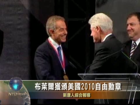 【新唐人2010年9月14日訊】美國國家憲法中心於9月13日,將美國2010年自由勛章頒給了英國前首相布萊爾,表彰他在推動北愛和平進程方面所做出的努力,布萊爾在美國前總統克林頓手中接下勛章併發表了得獎感言。