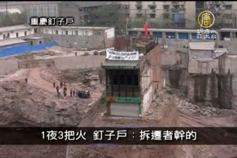 大陸各省市區經常發生拆遷糾紛,屢傳釘子戶與拆遷者衝突,12日江西宜黃縣強拆釘子戶3人自焚;南京市白下區釘子戶陳先生上網發帖,指控一夜遭人放火3次。