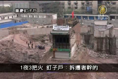 大陸各省市區經常發生拆遷糾紛,屢傳釘子戶與拆遷者衝突,12日江西宜黃縣強拆釘子戶3人自焚;南京市白下區釘子戶陳先生上網發帖,指控一夜遭人放火3次。