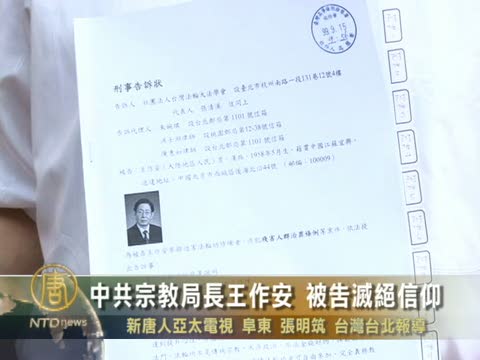 台灣法輪功團體控告中共國宗局長王作安違犯「殘害人群罪」及「民權公約」規定,這是三天來,繼控告陝西省代省長趙正永之後,法輪功對來臺的中共官員提出的第二起刑事告訴案。